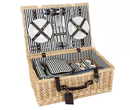 Greenfield-Kollektion Deluxe Cheltenham Willow 4 Person Picknickkorb - Mitternachtsblau und weiß gestreiften LiningInhalt: 4x Porzellan -Tasse, 4x Porzellanteller, 4x Edelstahl-Besteck, Salz und Pfefer Treuer aus Kunststoff, Kühlfach und Kunststoff-Box