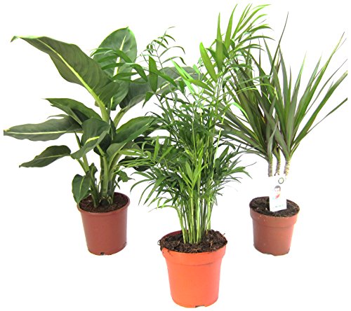 Drei ausgewählte Pflanzen für die Fensterbank. Diese Zimmerpflanzen sind leicht und schick. Bitte ausreichende Bewässerung, aber im Grunde vermeiden Staunässe. Einmal haben die Pflanzen genug zeigen Wasser, dass die Blätter, indem man hängen, sobald das Wasser zur Bewässerung die Wurzeln der Musik erreicht auf.Lieferung ohne Deko.Dieffenbachia getan stehen zurück, Chamaedorea, Dracena marginata